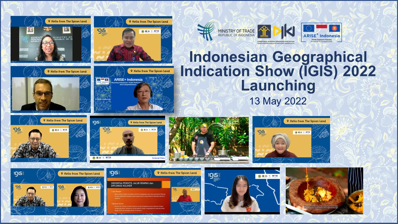 Under the auspices of the Directorate General of Intellectual Property (DGIP) of the Ministry of Law and Human Rights and the Directorate General of National Export Development (DGNED) of the Ministry of Trade, the ARISE+ Indonesia programme virtually launched the Indonesian Geographical Indication Show (IGIS) 2022 on Friday (13/05). The launch of IGIS 2022 whose tagline is "Enhancing the Value of Indonesian High Quality Agri-food Products through the Spectrum of Geographical Indications” was marked by a webinar entitled “Hello From The Spices Land”. The event gathered prominent figures from the culinary, gastronomy and retail industries, including Willian Wongso (Gastronomy Expert), Helianti Hilman (Founder of Javara), and Maria Suwarni (Marketing and Merchandising Director of Ranch Market Group).