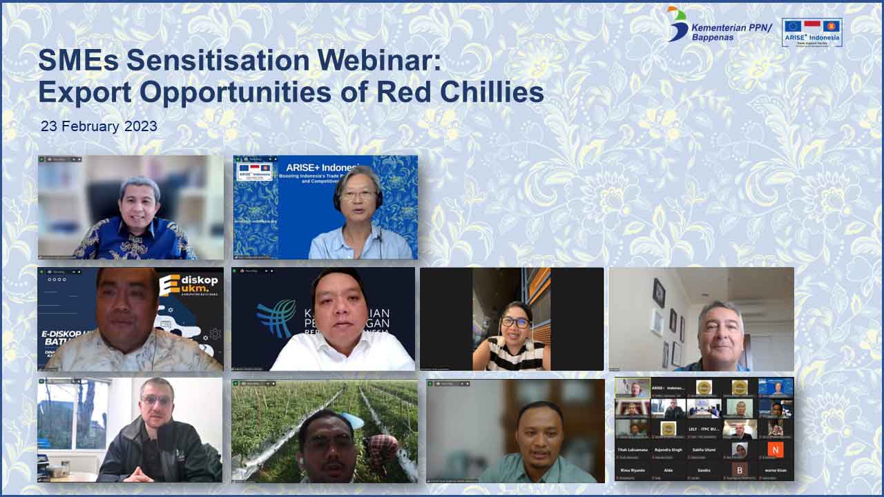 The opportunities and standards requirements in Chilli export were discussed during the SME Sensitisation Webinar: What Does It Take to Export Red Chilli Products, on 23 February 2022. The webinar, organised by the Ministry of National Development Planning Agency (Bappenas) in collaboration with ARISE+ Indonesia, was part of support to the Major Project for Integrated MSME Development designed and coordinated by Bappenas and jointly implemented with the Ministry of Cooperative and MSME, and other relevant ministries.